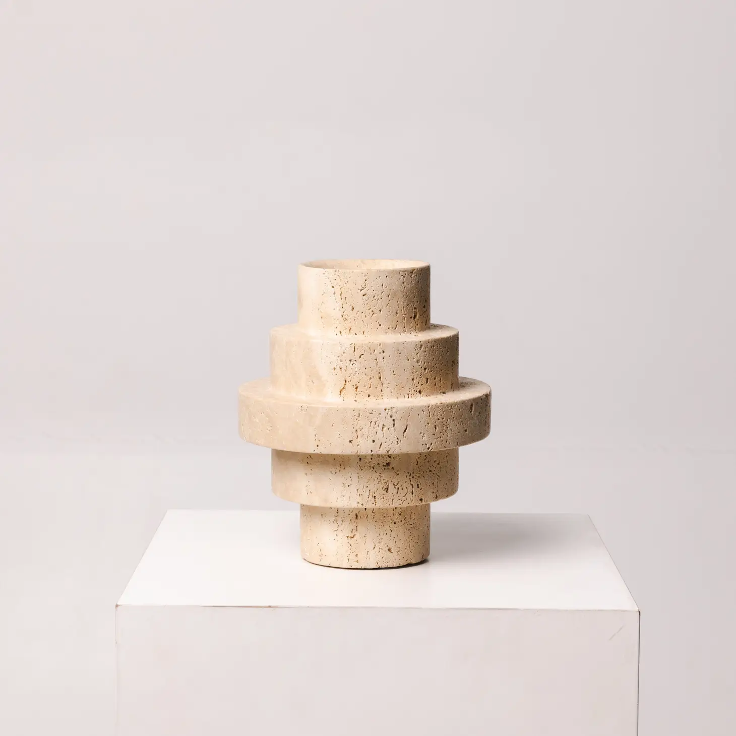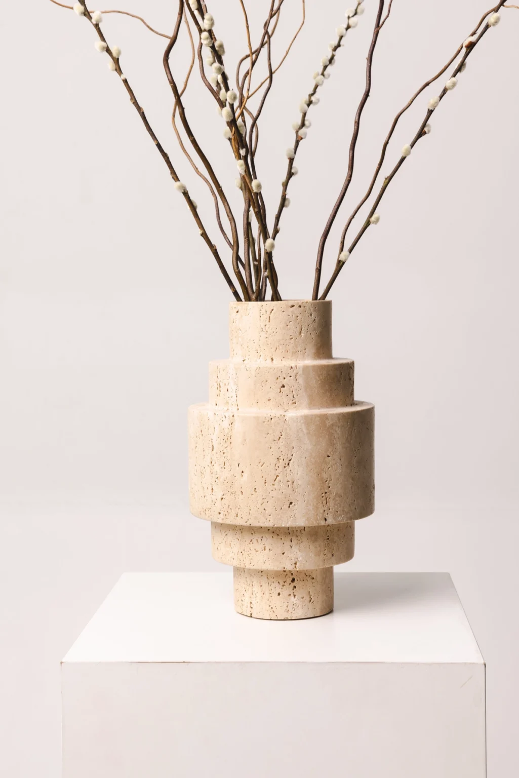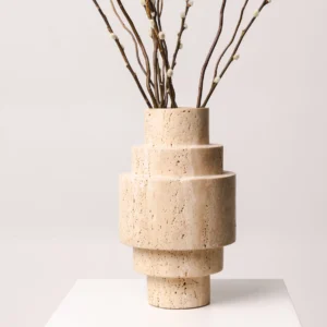 Voeg een vleugje natuurlijke schoonheid toe aan je interieur met onze prachtige Coast of Kikai. Deze vaas is met de handgemaakt en van de natuursteen Travertijn (ofwel het nieuwe marmer). Deze elegante vaas, gemaakt van hoogwaardig Travertijn, is een perfecte aanvulling op je decor en brengt een vleugje tijdloze charme in elke ruimte.
