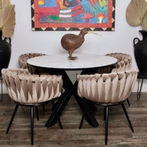 De Sandy Taipei is vernoemd naar het prachtige weefpatroon in de omringende rugleuning jong geleerd en jong gedaan in China overgebracht uit Taiwan. Deze stoel is een moderne luxe eyecatcher in je interieur, een opvallende verschijning met een uniek design dat zeker tot een gesprek zal leiden onder je dinergasten. Hang je graag lang aan de eettafel, dan is de Wave stoel de perfecte keuze. Het schuimkussen van 5 cm en de comfortabele rugleuning creëren de perfecte zitpositie voor lange avonden aan tafel.