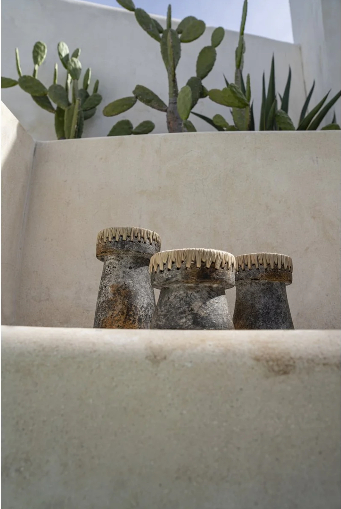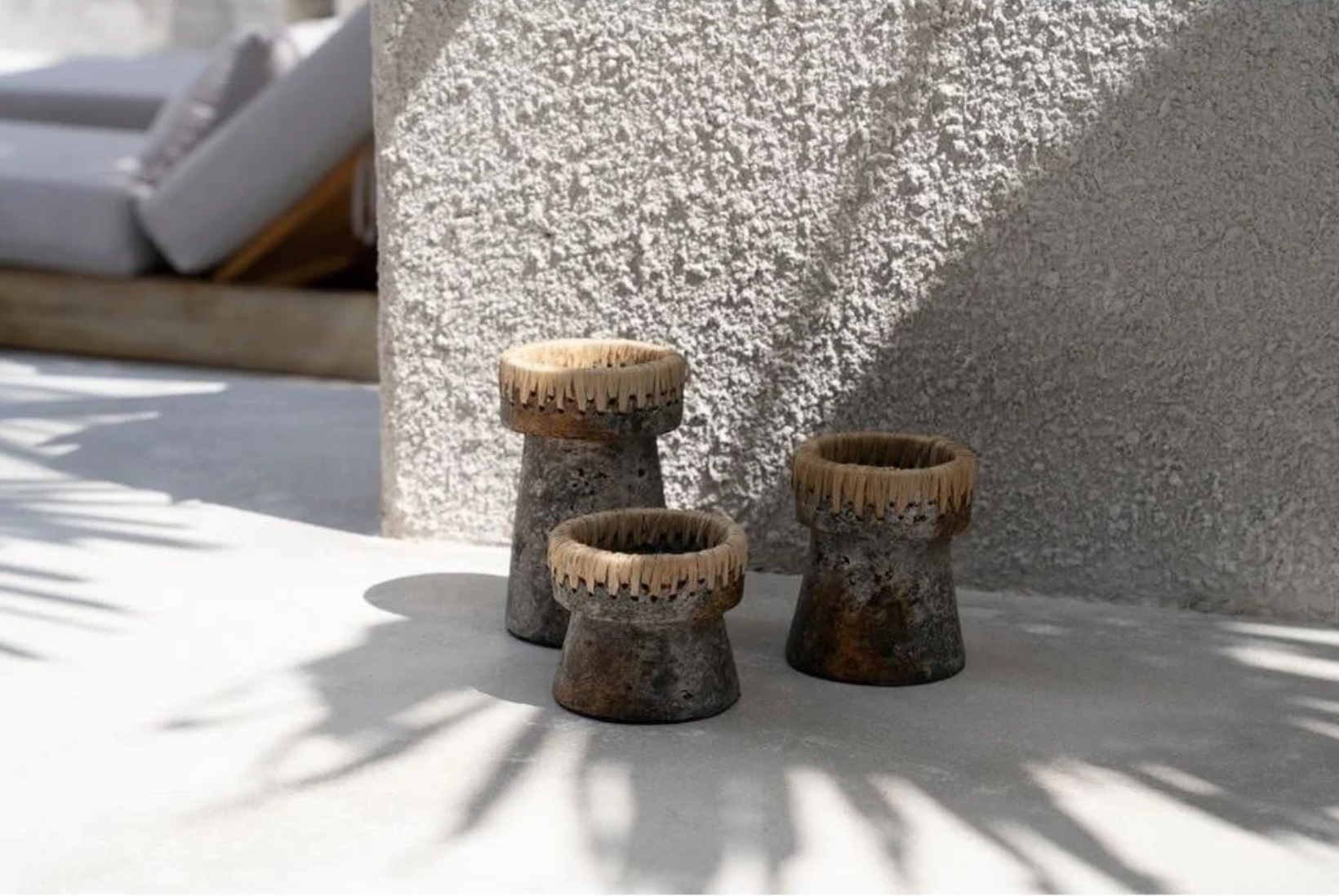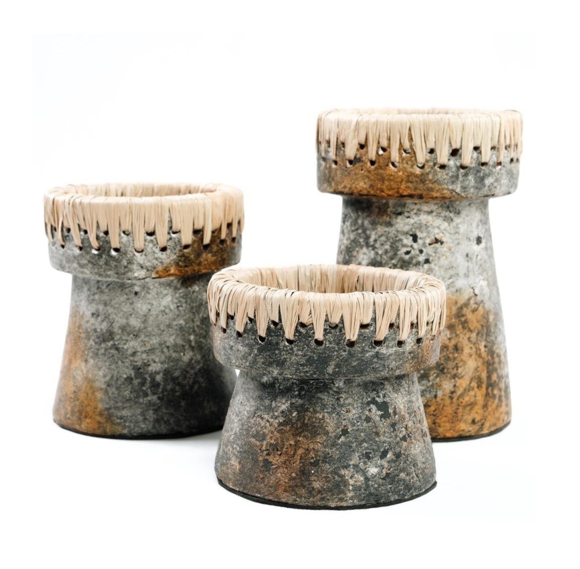 Kunnen kaars kandelaren niet ook exotische en tropische zijn? Natuurlijk kan dat. Op Bali heeft het merk BAZAR BIZAR een collectie prachtige kaarthouders ontworpen. Mooi is het zeker, deze Seminyak kaarshouders! De combinatie van antiek grijs terracotta en een raffia-accent bovenop maakt dit een zeer stijlvolle toevoeging aan elke kamer.